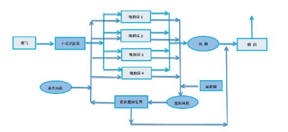 Spesifikasi tangki adsorpsi dan jumlah pemuatan adsorben dirancang sesuai dengan volume udara untuk memastikan kecepatan gas dan waktu tinggal tertentu, sehingga adsorben dapat secara efektif dan penuh menyerap pelarut organik dalam gas buang. Tangki adsorpsi bekerja secara bergantian, dan keadaan kerja tangki adsorpsi secara otomatis dialihkan oleh sistem kontrol otomatis PLC untuk secara bergantian melakukan tiga proses yaitu adsorpsi, desorpsi, pendinginan dan pengeringan, dan seterusnya.